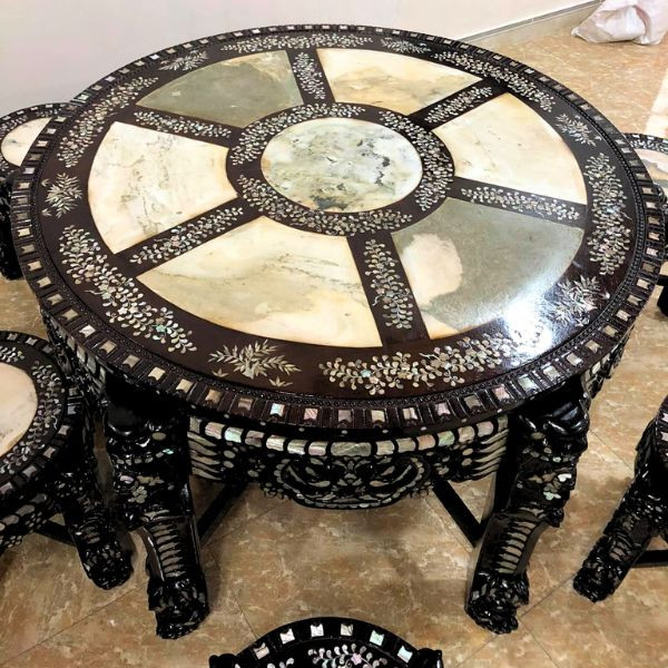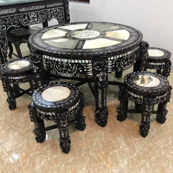 Bộ bàn ăn tròn gỗ gụ cẩn ốc xà cừ