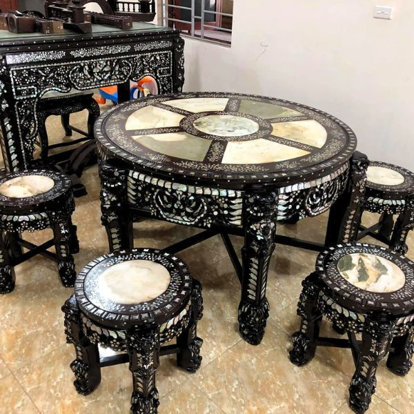 Với những nét phong thủy tốt và công năng sử dụng đa dạng, bộ ghế ăn tròn gỗ gụ cẩn ốc sẽ làm nổi bật không gian gia đình bạn.
