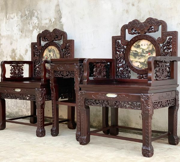 Ghế đơn được đóng rất chắc chắn và chân ghế được cố định xung quanh càng làm cho chiếc ghế thêm vững chãi hơn. Tựa ghế được thiết kế hình ô đá tròn ở vị trí trung tâm để tạo điểm nhấn. Phiến đá tự nhiên tròn hình vân mây vừa tạo sức hút cho bộ ghế vừa là sự cầu mong cho những điều may mắn vẹn tròn cho gia chủ.