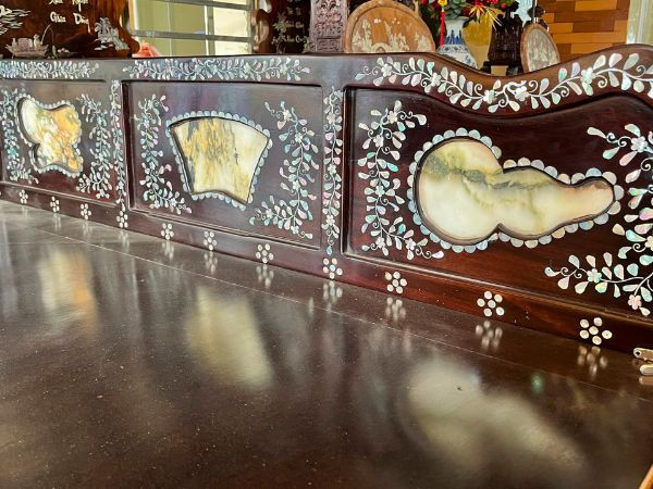 Sản phẩm được cơ sở chúng tôi sản xuất trên nền chất liệu gỗ gụ, khảm ốc xà cừ nhập khẩu Singapore.