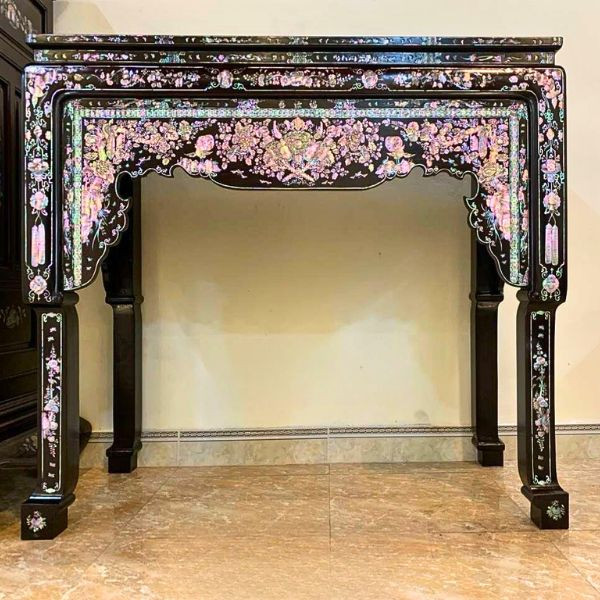 Chiếc bàn nghi thờ này được đặt đóng với kích thước rất lớn ( Loại nhất ) Rộng tới 128cm x Cao 127cm và Sâu 68cm, được lựa chọn rất kỹ lưỡng từ khâu nguyên liệu gỗ (Gỗ cẩm lai ta toàn lọc lõi) cho đến khâu ốc xà cừ dùng để khảm cho chiếc bàn này (ốc singapore loại đẹp nhất, giá trị nhất) toàn ốc đỏ lửa, vàng chanh, xanh thiên lý đẹp rực rỡ 7 màu đẹp mê hồn.