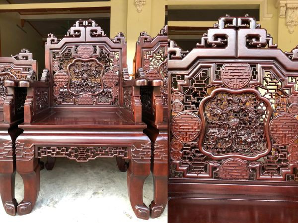Thọ và hình kim tiền cũng được lồng ghép và trạm trổ trên bộ trường kỷ với mong