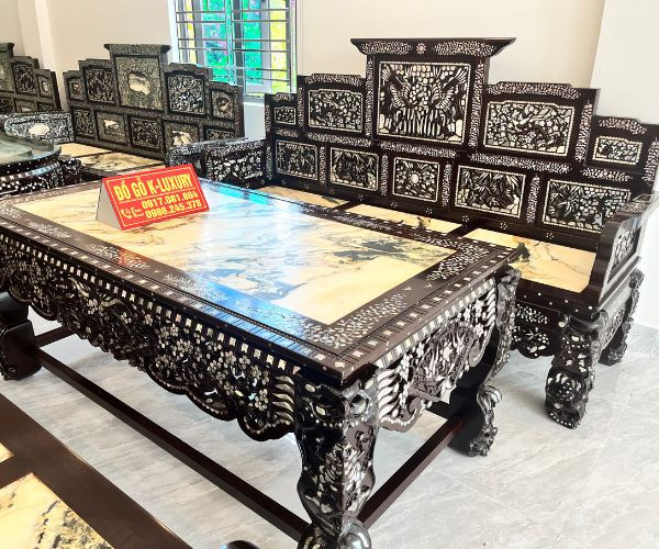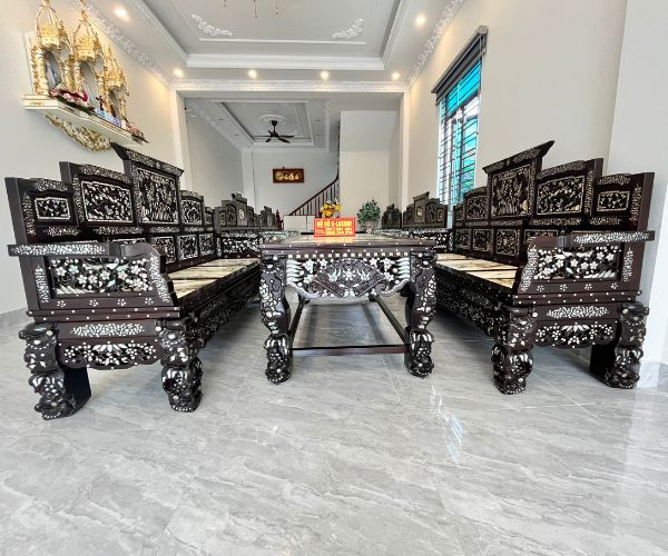 Chất liệu ốc xà cừ được nhập khẩu Singapore và được tuyển chọn cẩn thận mang lại những màu sắc rất bắt mắt trên bộ trường kỷ ngũ sơn đại này.