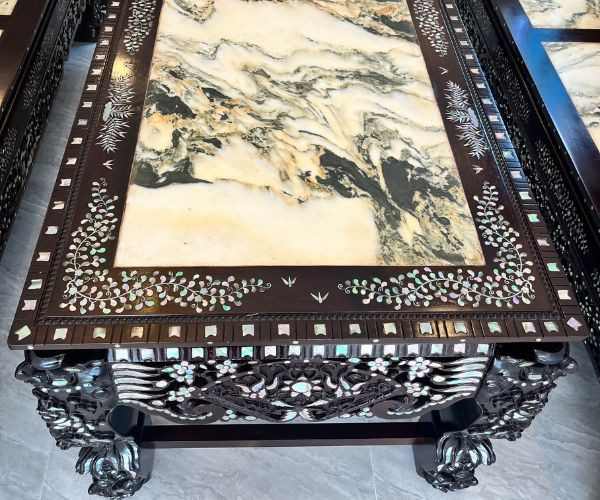 Điểm nhấn tiếp theo của mẫu trường kỷ ngũ sơn đại này đó là mặt bàn và mặt ghế được làm từ chất liệu đá cẩm thạch trắng tự nhiên, chất liệu đá được chúng tôi lựa chọn với vân mây cực đẹp, và độ dày dặn chắc chắn đảm bảo tuổi thọ của bộ ghế được lâu dài nhất.
