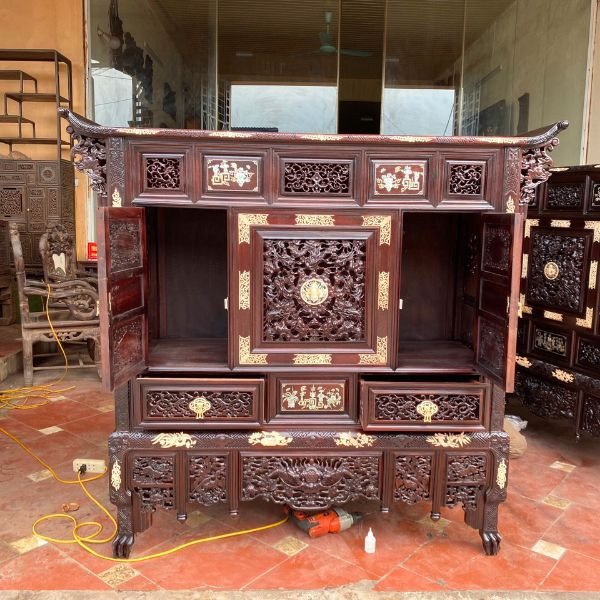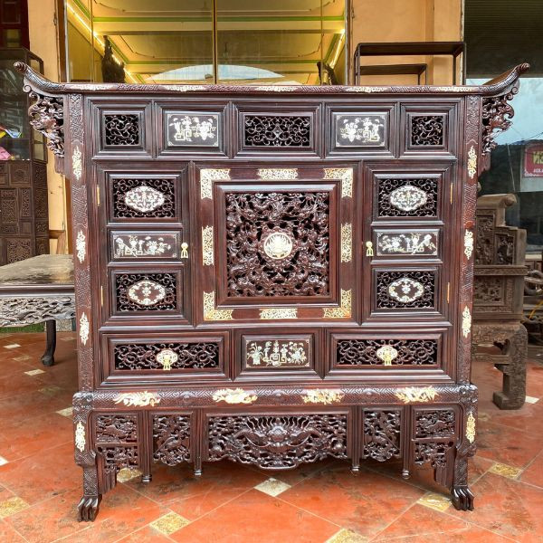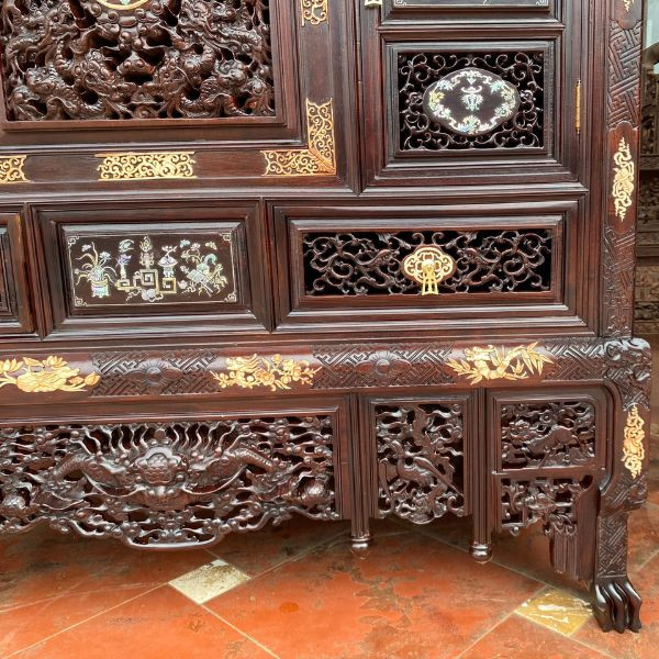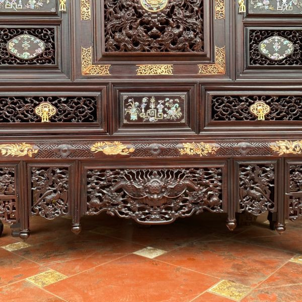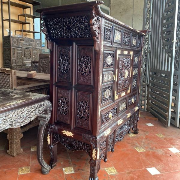 Không những mặt chính diện của tủ được cẩn ốc, mà mặt hông của tủ cũng được làm cầu kỳ không kém. Từng chi tiết nhỏ bên hông tủ đều sẽ được cắt khảm rất tỉ mỉ, để tôn lên những nét đẹp của sản phẩm.